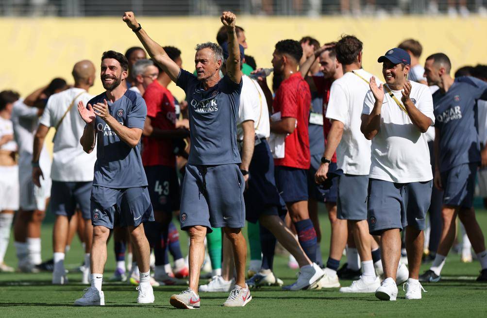 到目前为止,恩里克的球队在世俱杯上也是顺风顺水。小组头名出线,三场淘汰赛4:0轻取迈阿密国际、2:0击败拜仁慕尼黑、4:0大胜皇家马德里,打进10球,未丢一球。比分之外,他们在场面上更是行云流水。半决赛对阵皇家马德里被很多人认为是提前上演的决赛,但“大巴黎”仅用半个小时就杀死了悬念。